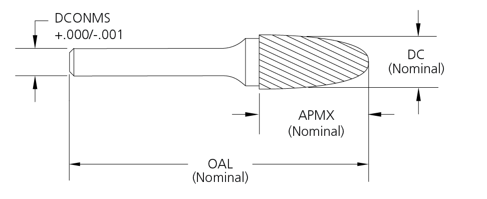 • Solid carbide 1/4" sizes and below, brazed construction over 1/4"