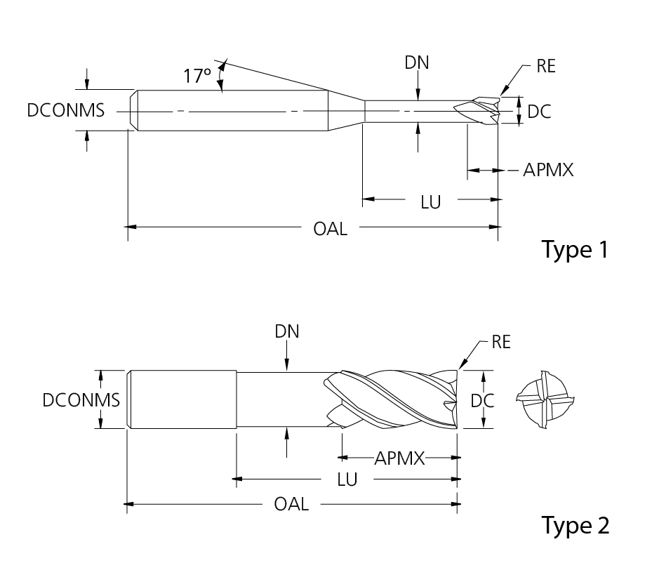 Tool No. EDP Diameter (DC) Shank Diameter (DCONMS) Neck Diameter (DN) Overall Length (OAL) Flute Length (APMX) Neck Length (LU) RE Coating Shank Type
