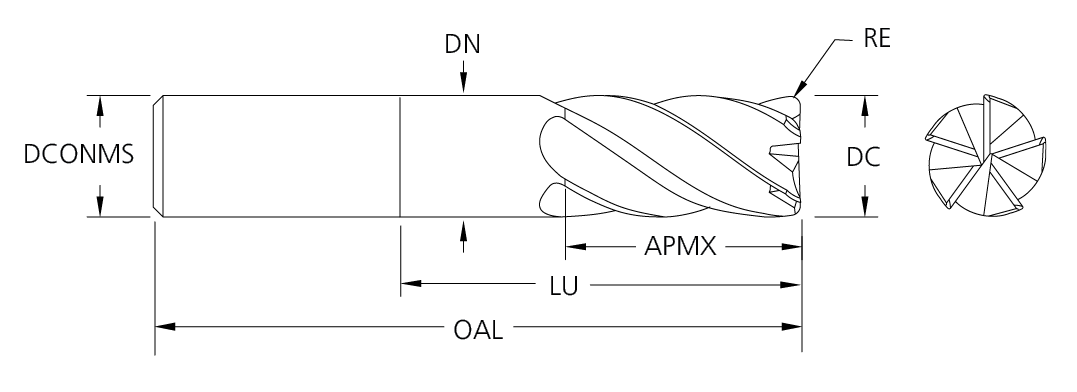 Tool No. EDP Diameter (DC) Shank Diameter (DCONMS) Overall Length (OAL) Flute Length (APMX) Neck Length (LU) RE Coating Shank Type