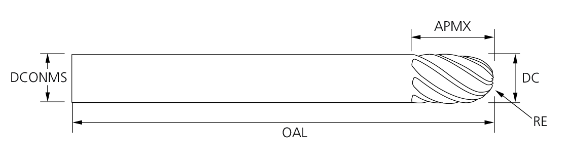 Tool No. EDP Diameter (DC) Diameter Dec Shank Diameter (DCONMS) Overall Length (OAL) Flute Length (APMX) Ball Radius (C) NOF RH Coating Shank Type